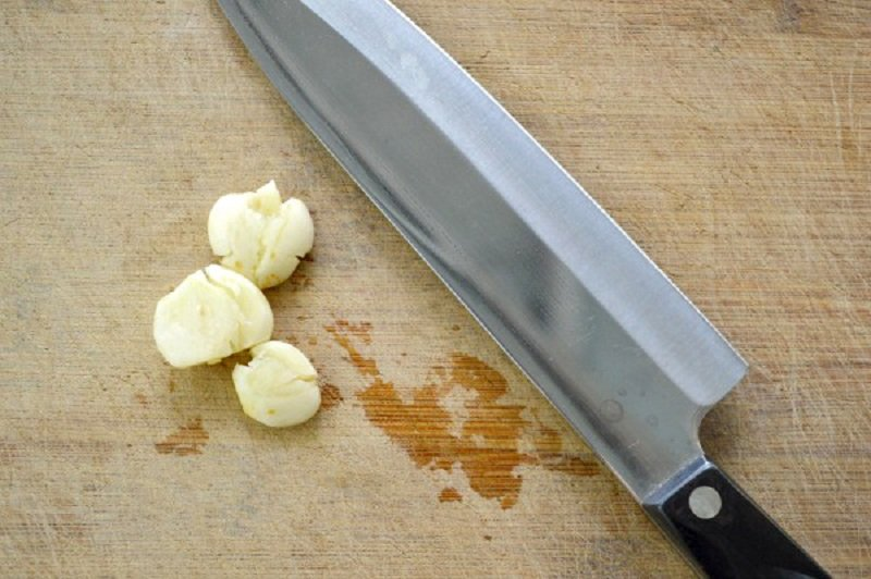 - Česnako skilteles sutrinkite didelio peilio plokščiąja puse.