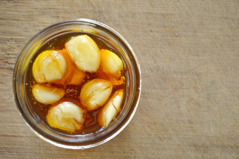 - Sudėkite česnaką į stiklainį ir užpilkite medumi.