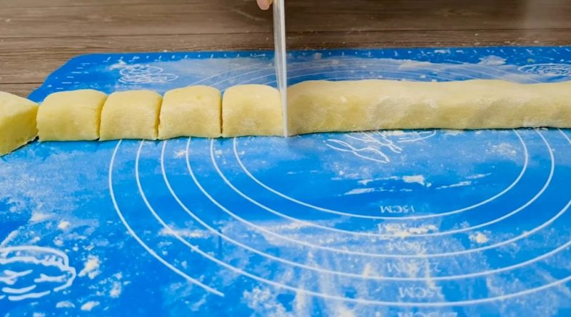 Kai pasiekiame bandymo konsistenciją, turite rankiniu būdu suformuoti ilgą dešrą. Tešlą dalijame į mažas dalis.