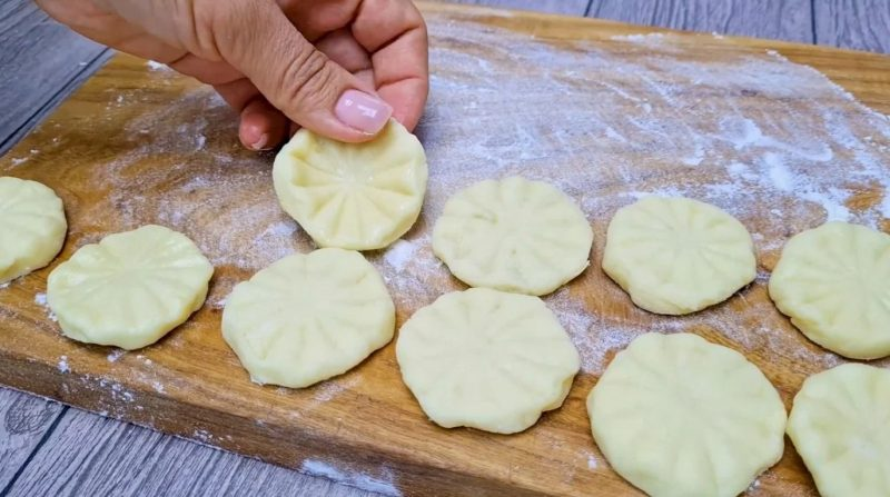 Virtos bulvės pabarsto druska ir minkomos griežinėliais iki tyrės konsistencijos. Supilti miltus ir gerai išmaišyti.