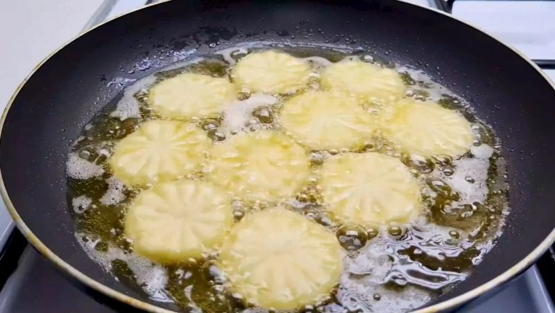 Keptuvėje įkaitiname augalinį aliejų, ant vidutinės ugnies kepame iki auksinės plutos iš visų pusių.