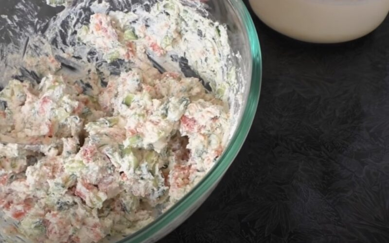 Į tešlą integruojame augalinį aliejų ir pieną, paruošiame skystą blynų tešlą.Palikite tešlą po dangčiu 20 minučių – primygtinai reikalauti. Šiuo metu, norint užpildyti, būtina pašalinti sėklas iš agurkų, supjaustytų į mažą kubą. Panašiai supjaustykite žuvį, blizginkite smulkius krapus. Visi smulkinti produktai yra išdėstyti sūrio dubenyje, išmaišyti.