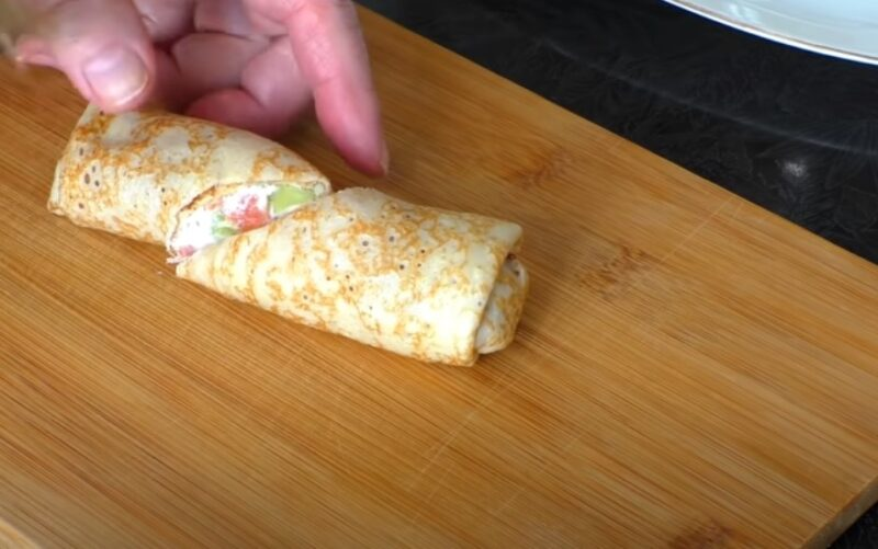 Keptuvėje su nedideliu kiekiu aliejaus mes kepame blynus standartiniu būdu. Mes įdedame įdarą ant blyno krašto, suvyniojame į ritinį ar voką.