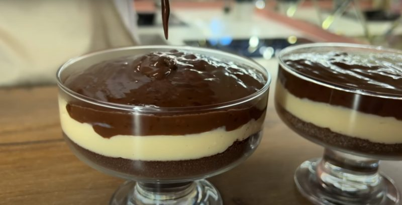 Mes tolygiai paskirstome šokoladinį pudingo sluoksnį ant paviršiaus. Išimkite desertą šaldytuve 2 valandoms.