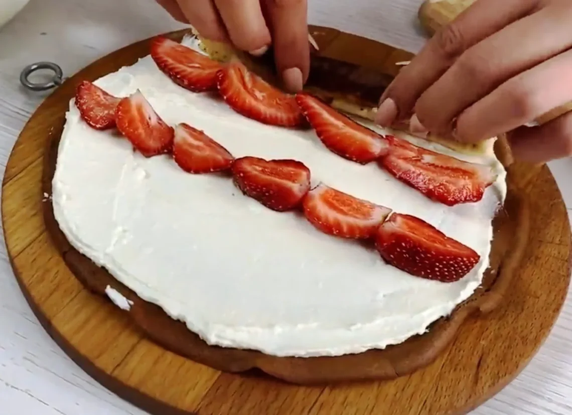 Tiesiog pažvelkite į šį tobulą gabalėlį! Dėl sniego baltos varškės ir ryškių braškių derinio ritinys atrodo kaip brangus pyragas, nors jis yra paruoštas iš paprastų blynų.