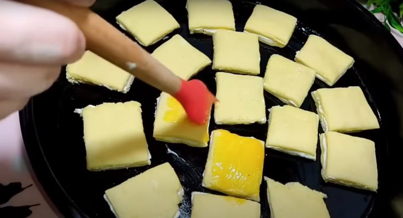 Mes įdedame juos į pergamento dengtą keptuvę ir sutepame plaktu tryniu.