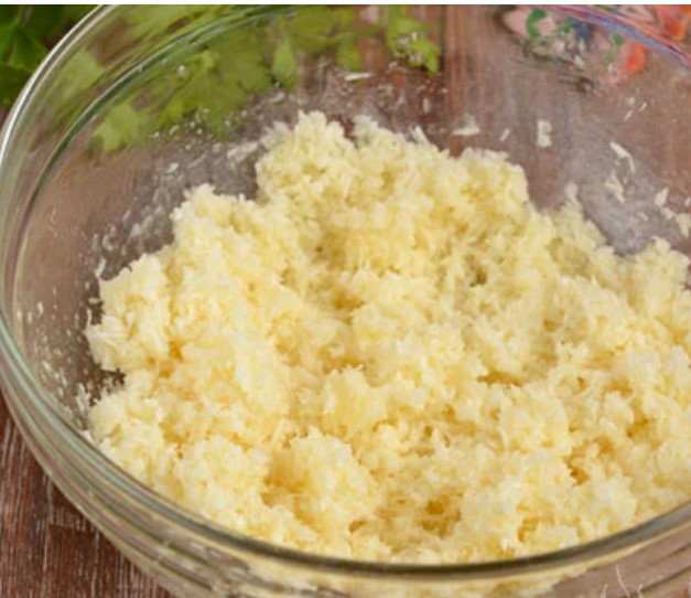 Gautame mišinyje mes supilame kokoso drožlę, išmaišykite į tyrės būseną.