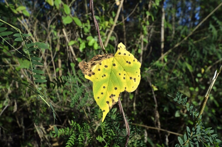Lapai: nudžiūvę arba supuvę lapų galiukai, geltonos ir rudos dėmės ant lapų.