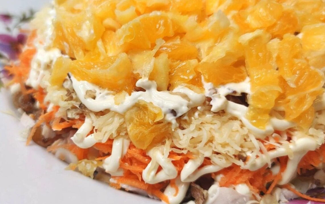 Šeštasis sluoksnis yra apelsinų kubeliai, šiek tiek išspausti iš sulčių, kad salotos netekėtų.