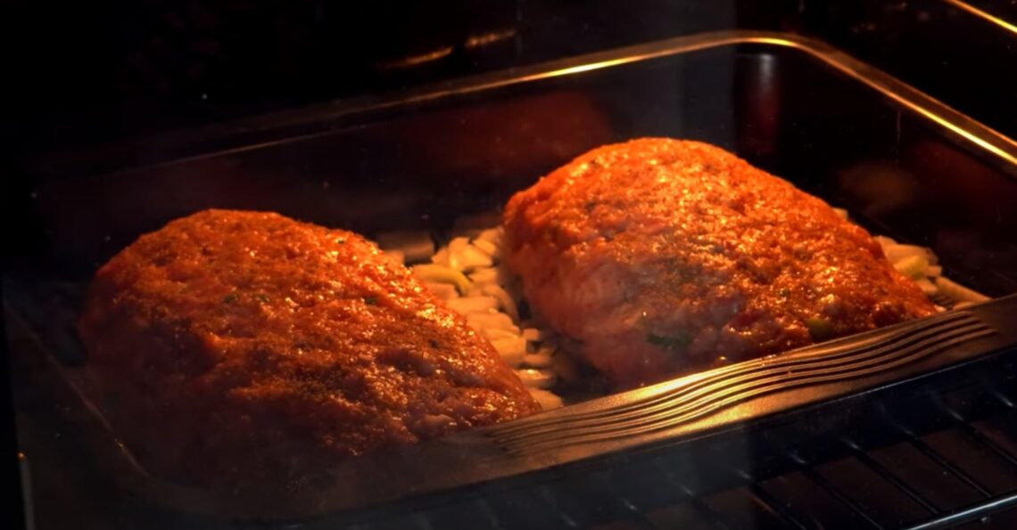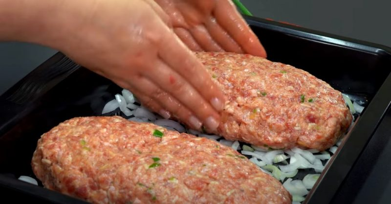 Mes pabarstome formą svogūnais, ant viršaus uždedame didelius kotletus, pabarstome kalendra ir muskato riešutu viršuje.