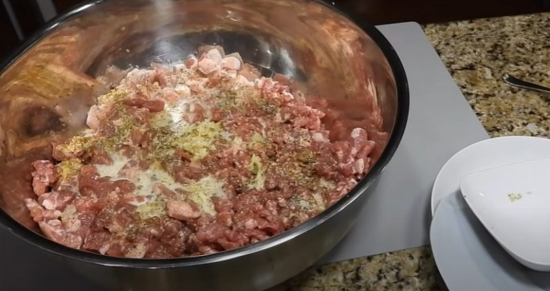 Viena vištienos krūtinėlė kartu su puse viso mėsos kiekio yra susmulkinta per mėsmę. Antroji kiaulienos pusė kartu su taukais supjaustoma į mažus kubelius. Sujunkite smulkintą mėsą su susmulkinta ant kvadratinės mėsos.