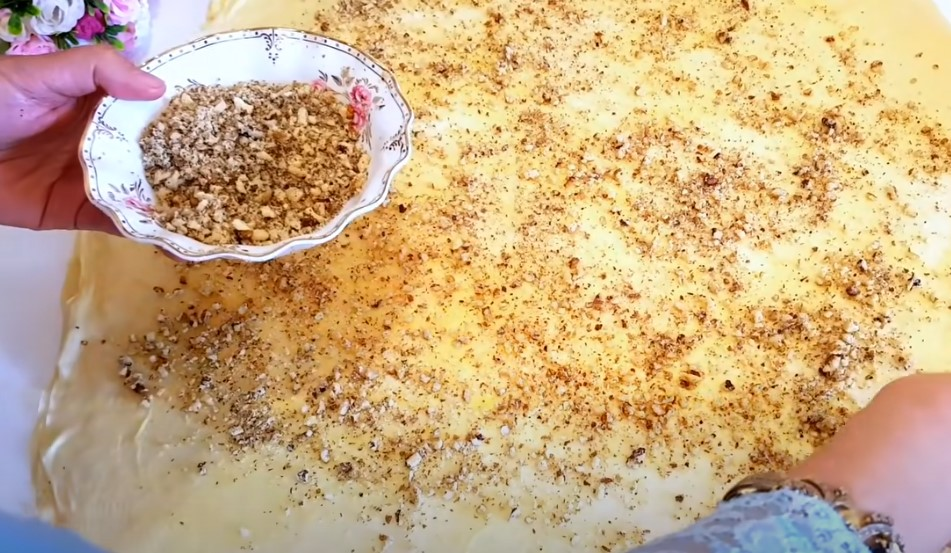 Mes pabarstome susmulkintais riešutais – žemės riešutais arba klajojame pagal jūsų skonį ir įdėkite sluoksnį į ritinį.