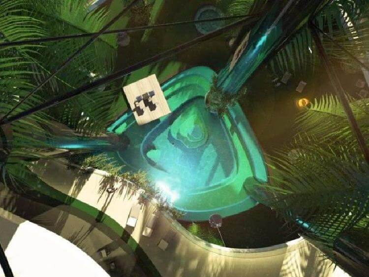 Vaizdingoje paplūdimio terasoje yra keli baseinai, kepsninės zonos, povandeninė valgomojo zona, ryklių maitinimo stotis ir lauko kinas.