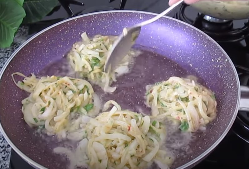 Mes sušildome augalinį aliejų keptuvėje ir uždedame masę ant šaukšto.