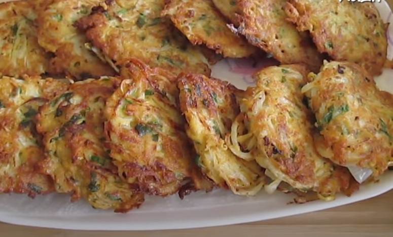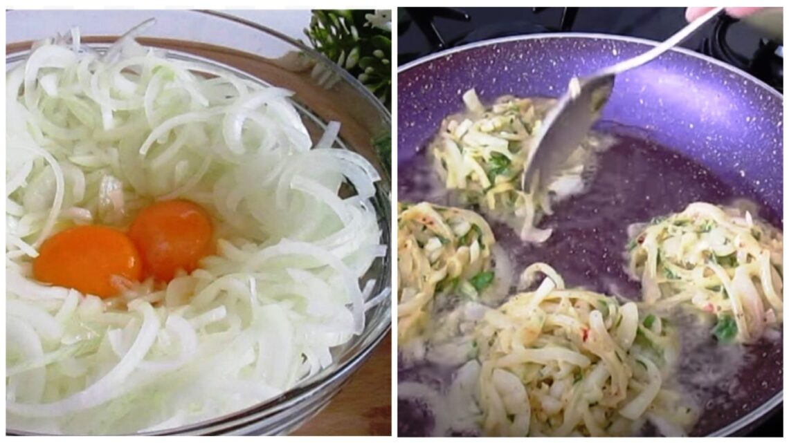 Išspauskite svogūną, sumaišykite su kiaušiniais, miltais ir krakmolu, įpilkite įvairių prieskonių ir smulkiai supjaustytų žalumynų, tarkuotų ant didelės bulvių terikos.