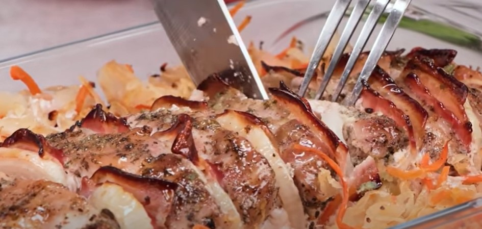 Sultinga kiauliena orkaitėje. Mėsa neišdžiūsta: mes gaminame pjūvius ir įterpiame šoninę su svogūnais
