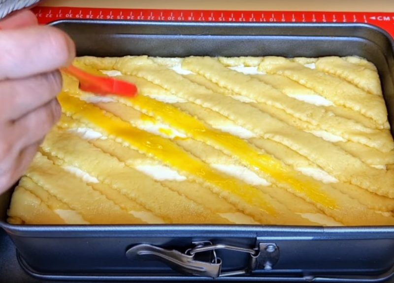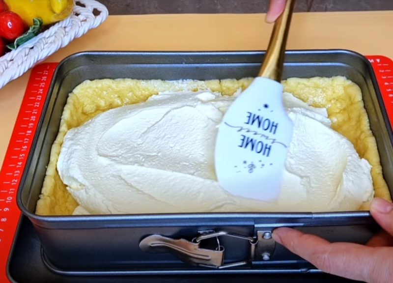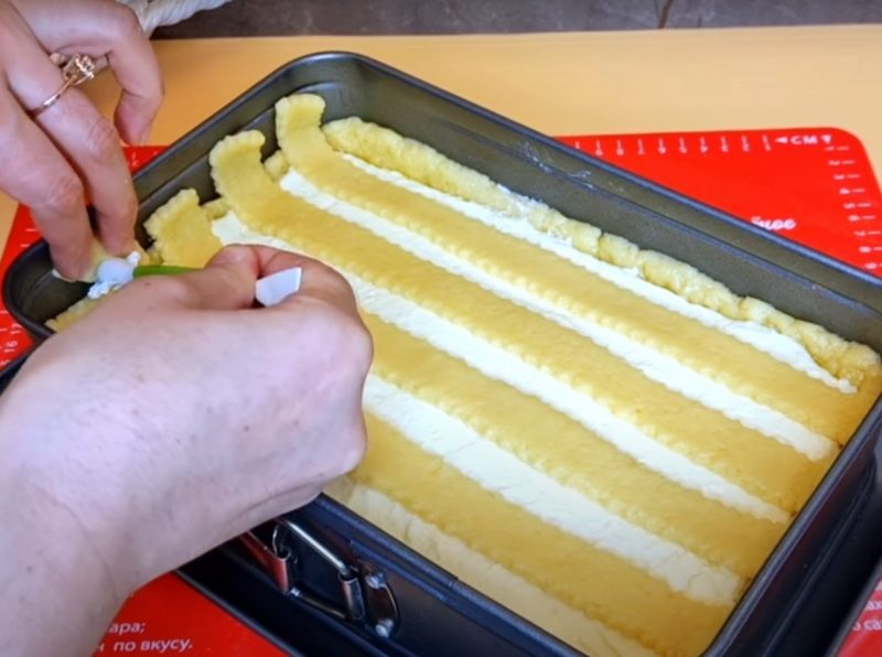 Tešla yra padalinta į dvi dalis, dar vieną, antra mažiau. Didesnė dalis yra išdėstyta kepimo formos apačioje. Suderinkite tešlą ant paviršiaus rankomis, kad tolygiai pasiskirstytumėte. Nepamirškite padaryti šoninius rinkinius ant formos sienų.