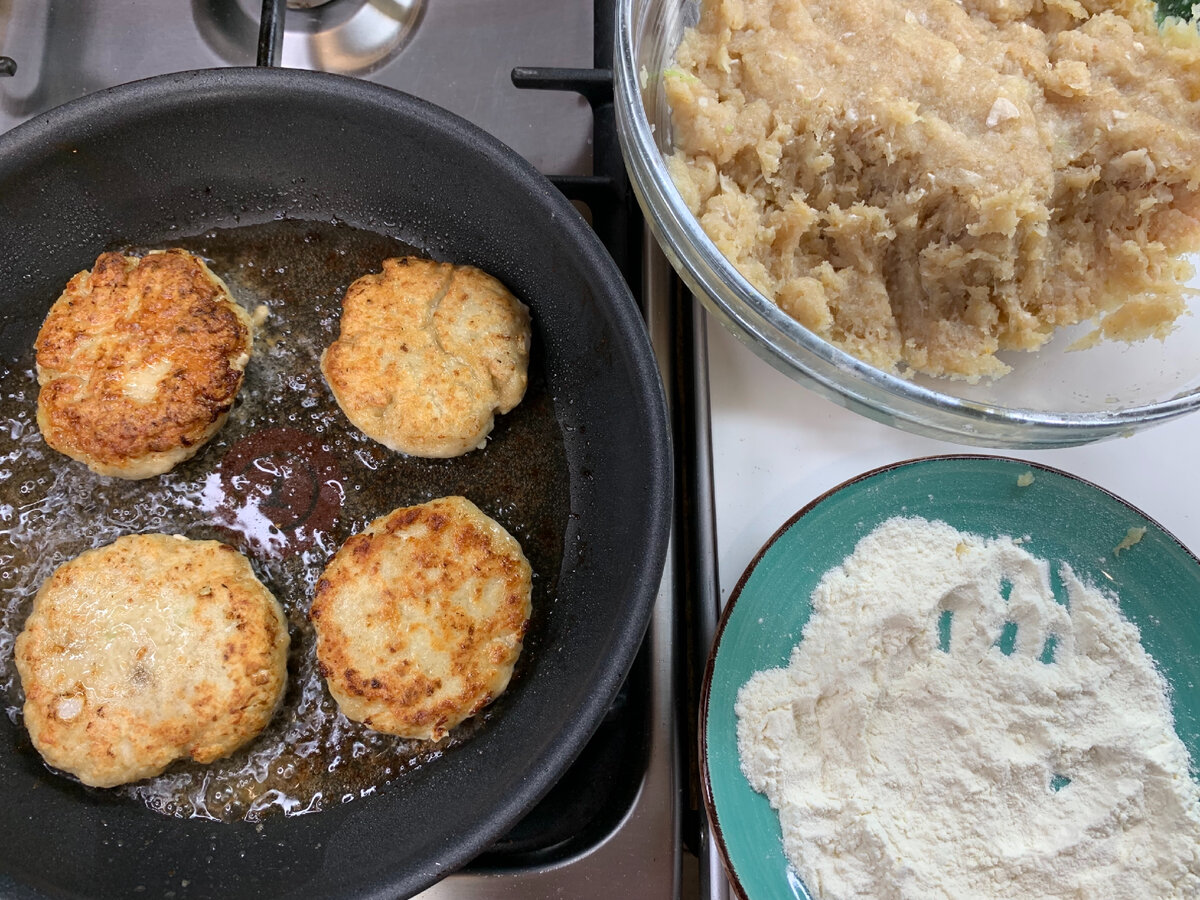 Forma iš smulkintų „kumpių“ ir sugriauna juos miltuose iš abiejų pusių, kepkite kepkite į auksinę plutą (nereikia leisti)