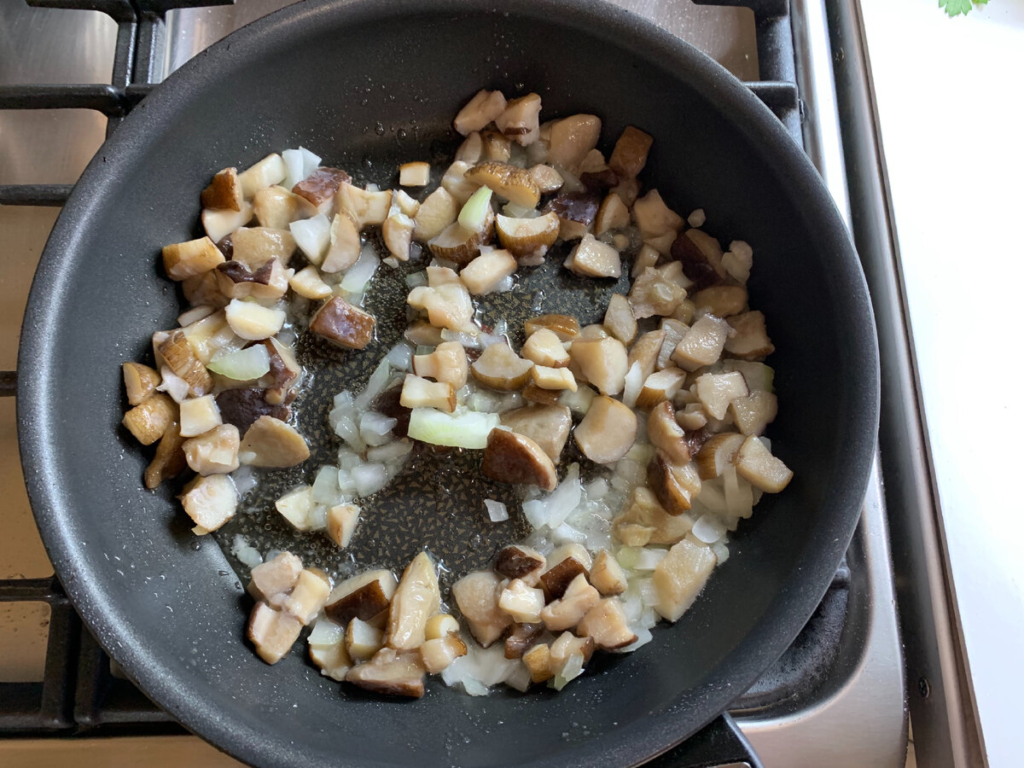 Nuplaukite grybus, supjaustykite mažais kubeliais, tada kepkite juos sviestu, supjaustykite mažas virves ir įdėkite kepti į grybus, pasiruoškite