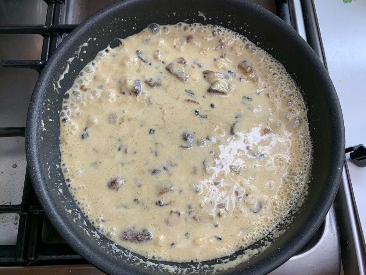 Sudėti grietinę, šiek tiek vandens, jei norite, kad padažas būtų storesnis, grybų skrudinimo etape, supilti miltus, tada išpilti grietinę ir vandenį.